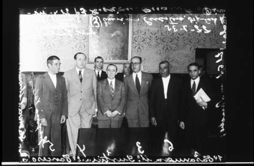 Título.- (1) CÁNDIDO CASANUEVA, MINISTRO DE JUSTICIA. ACOMPAÑADO DE (2) CONCESO COSO LANGA, (3) ENRIQUE CUARTERO, (4) MANUEL GARCIA ATANCE, (5) GREGORIO VALERO Y (6) LEON SANCHEZ, VICTIMAS ESTOS DOS ULTIMOS DEL ERROR JUDICIAL OSA DE LA VEGA, HACIENDOLES ENTREGA DE 3.000 PESETAS.